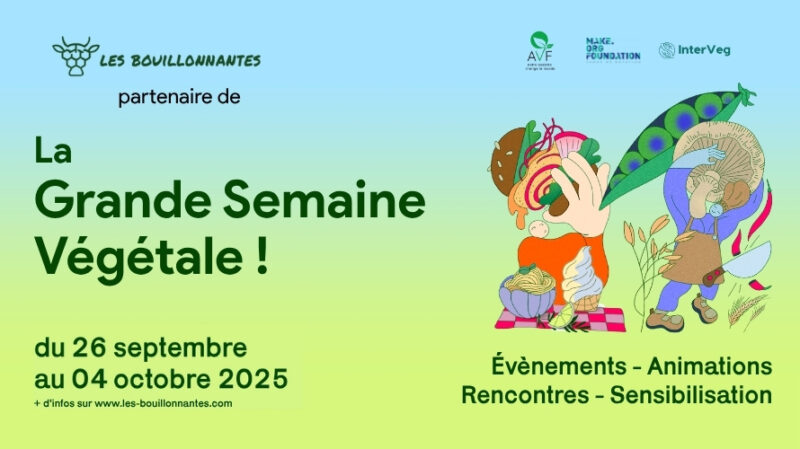 L’association les Bouillonnantes s’associe à la Grande Semaine Végétale, du 26 septembre au 4 octobre 2025. Initiée par Make.org Foundation, en partenariat avec l’Association Végétarienne de France (AVF) et InterVeg, la Grande Semaine Végétale proposera, partout en France, une mobilisation collective pour tester une alimentation plus végétale.